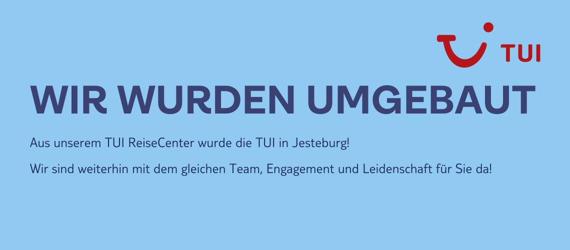 Willkommen bei der TUI, Ihrem erstklassigen Reisebüro in Jesteburg. Wir bieten Ihnen maßgeschneiderte Reisen, die auf Ihre Wünsche und Bedürfnisse abgestimmt sind. Ob Sie einen entspannten Strandurlaub, ein aufregendes Abenteuer oder eine Kreuzfahrt suchen, unser erfahrenes Team hilft Ihnen, Ihre Traumreise zu planen. Kontaktieren Sie uns noch heute, um mehr über unsere exklusiven Reiseangebote zu erfahren. Wir freuen uns auf Sie!