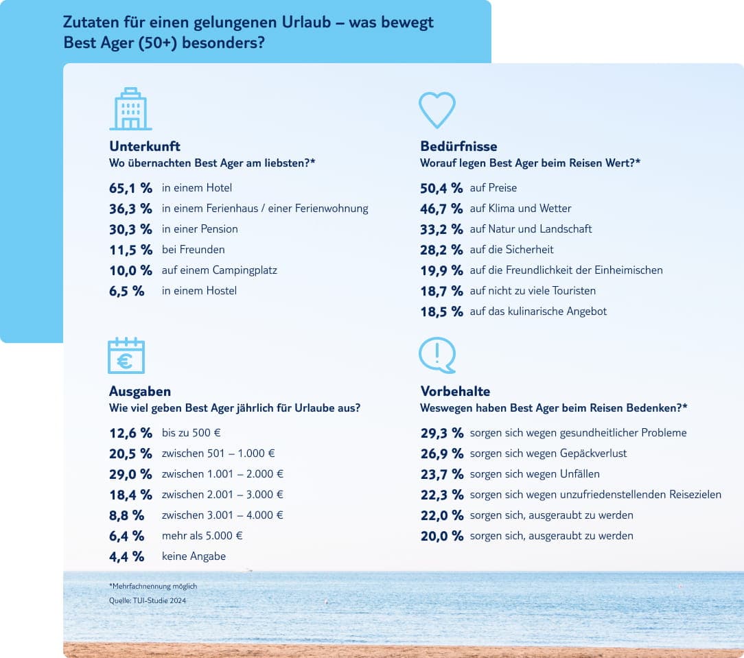 Best Ager schätzen die Urlaubsjuwele vor der eigenen Haustür: 42,3 % planen laut der im Januar 2025 durchgeführten TUI-Studie, im Sommer innerhalb Europas zu verreisen, 23,4 % verbringen ihren . Bequem erreichbar, abwechslungsreich und voller neuer Entdeckungen – ganz im Sinne der Ü50er: 32 % geben an, den größten Teil ihres Reisebudgets für Touren und Ausflüge auszugeben, 47, 2 % lassen für gutes Essen und Trinken die Urlaubskasse klingeln.