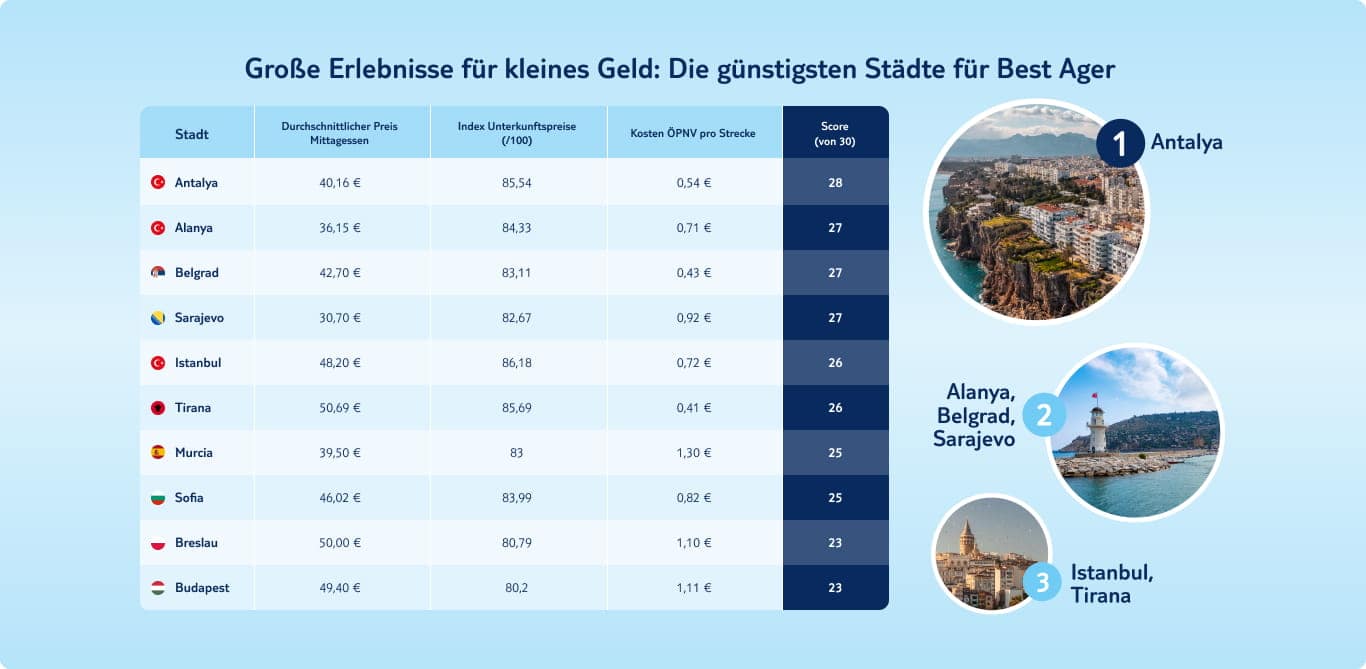 Wie wäre es mit einem ausgiebigen 3-Gänge-Menü für zwei Personen in Alanya für durchschnittlich gerade einmal 36,15 €? Oder mit einer Sightseeing-Tour in Antalya, wo eine ÖPNV-Fahrt nur 50 Cent kostet? In Sarajevo gibt es ein leckeres Mittagessen oft schon für 15 € und im spanischen Murcia lässt sich ein komplettes Menü genießen, ohne dass der Geldbeutel leidet. Auch die Unterkünfte in diesen Städten sind erstaunlich erschwinglich – sei es eine stilvolle Ferienwohnung in Istanbul oder ein charmantes Boutique-Hotel in Belgrad.