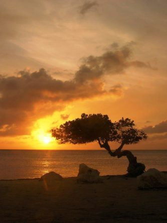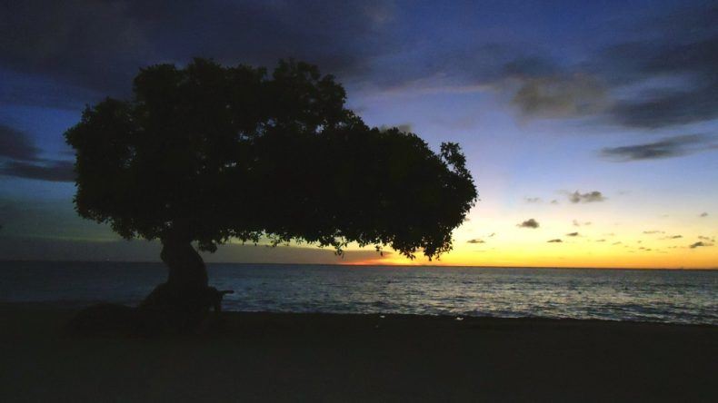 An der Küste, Richtung Norden, schlendere ich am nächsten Tag den Eagle Beach entlang. Jetzt verstehe ich Natalie, die ihn als einen der schönsten weit und breit bezeichnete. Das Wasser ist glasklar und der Sand schimmert. Am Besten gefallen mir die knorrigen Divi-Divi-Bäume, die als natürliche Kompasse dienen: Sie beugen sich, während sie wachsen, den Passatwinden. Wenn ich mich auf Aruba je verlaufe muss ich mich also bloß erinnern: Hier zeigen alle Divi-Divi-Bäume in Richtung Südwest.