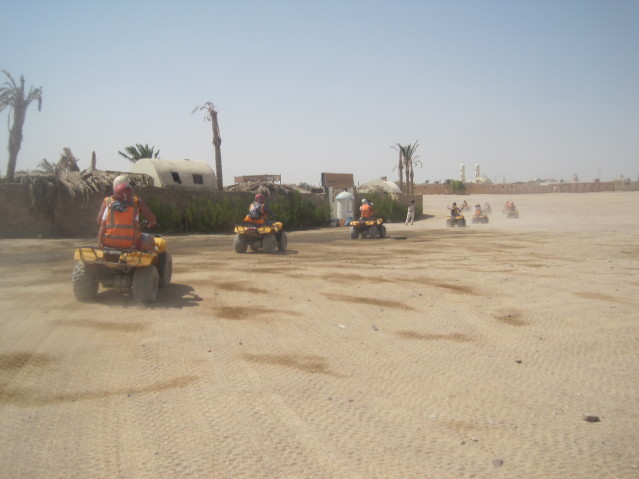 Ganz entspannt werde ich nach dem Mittagessen von der TUI Reiseleitung am Hotel abgeholt. Zusammen mit ein paar weiteren Gästen fahren wir zum Quad-Center in der Nähe von Hurghada. Ich steige aus und spüre sofort eine heiße Wand, die mir entgegen kommt. Ohne die Brise vom Meer sind 40 Grad im Schatten doch wärmer als gedacht. Wir bekommen direkt eine kurze Einweisung zur Sicherheit und richtigen Benutzung der Geräte. Uns wird der gute Rat gegeben, unter dem Helm ein Tuch zum Schutz für den Kopf und Mund zu tragen. Zum Glück habe ich in muslimischen Ländern immer ein Tuch dabei, falls ich meine Schultern bedecken muss. Dieses binde ich mir um den Kopf und den Hals und setze den Helm auf. Nun bin ich bereit, um auf das Quad zu steigen. Die anderen sind auch auf ihren Maschinen positioniert und unsere Tour kann endlich losgehen.