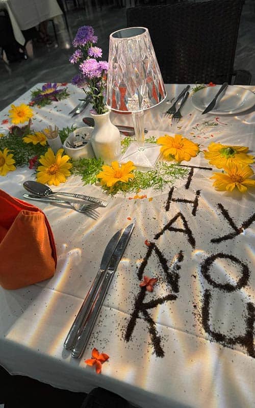 Mit Blüten geschmückter Abschiedstisch im Lanka Princess