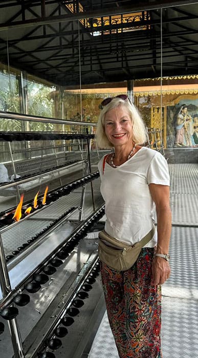 Sabine in der Tempelanlage. Hier kann eine Kerze angezündet und aufgestellt werden, um sich etwas zu wünschen.