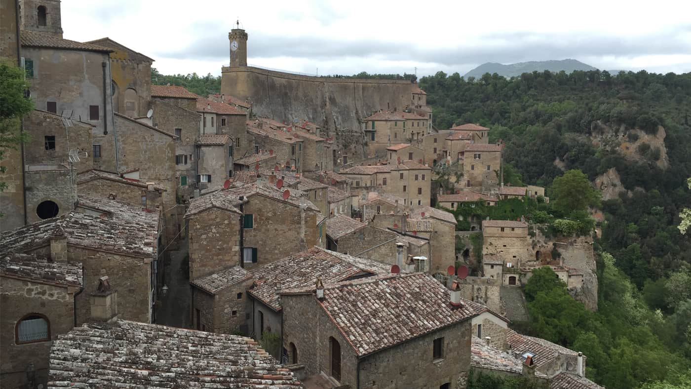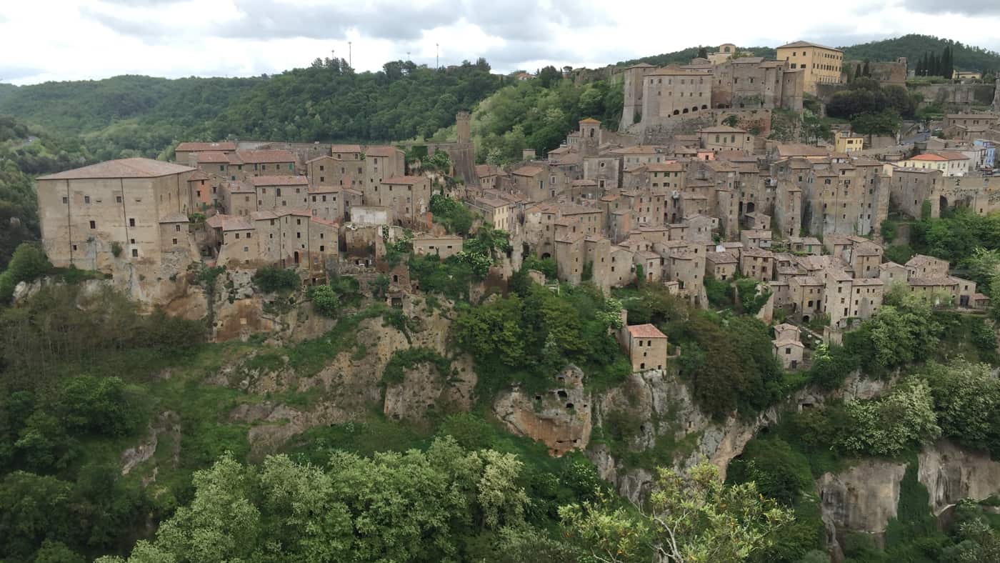 Aus der Entfernung zeigt sich Sorano und seine einzigartige Lage in voller Pracht.
