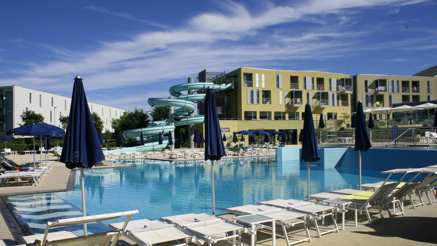 Ein riesiger Pool mit drei Wasserrutschen und Splashpark-Bereich. Deine Kids werden begeistert sein!