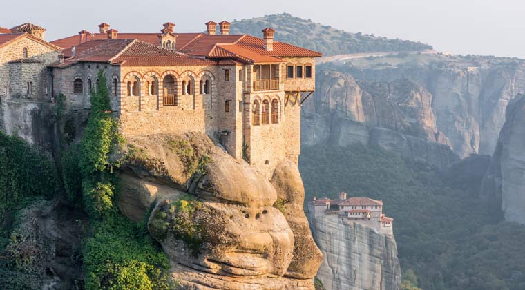 Wenn dichter Nebel herrscht oder die Wolken tief stehen in der Region Thessalien, scheinen diese Bauten förmlich in der Luft zu schweben. Ab dem 11. Jahrhundert wurden hier auf mächtige, bis zu 500 Meter hohe Sandsteinfelsen nordwestlich von Athen 24 Klöster und Einsiedeleien gebaut, die heute zum UNESCO-Weltkulturerbe gehören. Da einst keine Wege zu den Gipfeln führten, mussten die Mönche Strickleitern benutzen und das Baumaterial mit Seilen hinaufziehen. Viele der Bauten sind heute verfallen, sechs werden noch von Nonnen und Mönchen bewohnt. Die Szenerie ist so pittoresk, dass sie sogar als Filmkulisse für einen James-Bond-Streifen diente – gegen anfänglichen Widerstand der Bewohner wurde in der 80er-Jahren der Film „In tödlicher Mission“ hier gedreht.