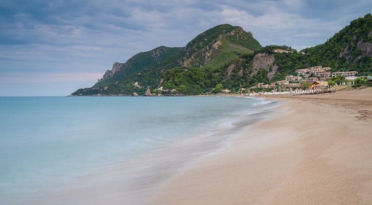 Als einer der schönsten Strände Griechenlands in malerischer Kulisse gilt der Glyfada Beach auf Korfu. Neben Sonnenliegen gibt es auch Beach-Betten und viele Tavernen in der Nähe.