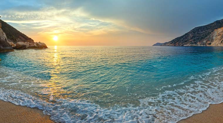 Sonnenuntergangsstimmung am traumhaften Myrtos Beach. | AdobeStock/wildman