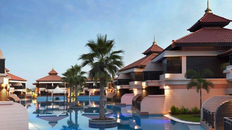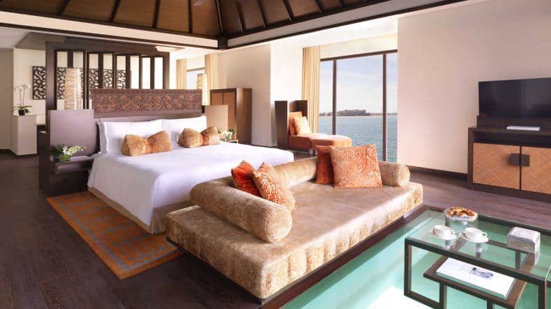 Wer das Poolwasser bevorzugt, kann zwischen einem Infinity-Pool, drei Lagunen-Pools und einem Whirlpool wählen. 293 schöne Zimmer und Villen warten in diesem von traditioneller thailändischer Architektur inspirierten Hotel auf euch. Einige davon mit direktem Poolzugang, andere mit privatem Pool. Noch mehr Luxus bieten nur die 100qm großen Overwater Villen mit bester Aussicht auf das Meer und Dubais Wolkenkratzer. Auch sonst lässt das Anantara Dubai The Palm Resort & Spa in Sachen Luxus & Komfort nichts anbrennen. Fünf Restaurants lassen euren Gaumen Freudensprünge machen – von internationaler Küche über Chinesisch, Thailändisch & Vietnamesisch, Australisch und Mediterran. Enspannen könnt ihr euch im wunderschönen Wellnessbereich „Anantara Spa“, dass zahlreiche (Paar)Behandlungsräume für eure Massage (z.B. Thai Massage, Arabische Massage, Schwedische Massage etc.) bietet. Auch beim türkischen Hammam dürft ihr euch zurücklehnen und genießen.