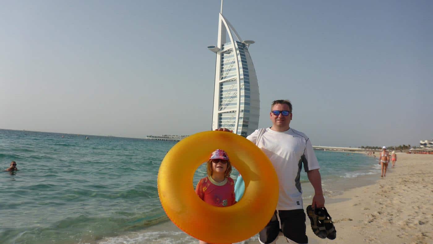 Der bekannteste Dubai Strand ist wohl der breite Sunset Beach beim Umm Suqeim Park. Der Strand ist super feinsandig und flachabfallend, ideal für Kids. Wie schon der Name vermuten lässt, könnt ihr hier traumhafte Sonnenuntergänge genießen. Außerdem habt ihr von hier aus einen direkten Blick auf das beeindruckende Bauwerk Burj al Arab, den Turm der Araber. Wer hier baden gehen möchte, bringt aber am besten Sonnenschirm und Liege mit. Ausleihen könnt ihr euch diese hier nämlich nicht.