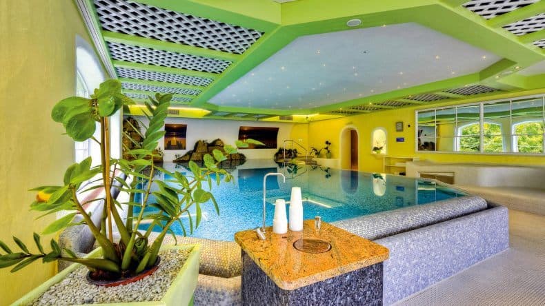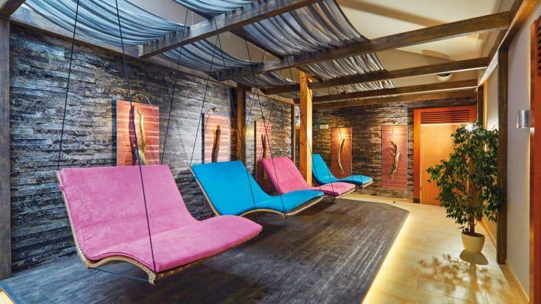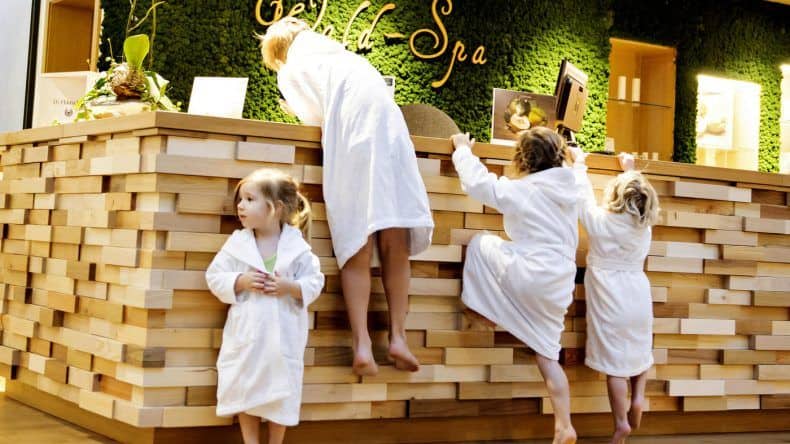 Draußen steht ein großer Abenteuerspielplatz mit Piratenschiff, Kletterturm, Geschicklichkeitsstationen und Doppelseilbahn bereit. Und es gibt einen hoteleigenen Reitstall, Streicheltiere und eine Waldhütte. Also Abenteuer an jeder Ecke. Gut geschulte Kinderbetreuer sorgen sich altersgerecht um eure Kids (gern auch schon direkt in der Früh – ab 09:00 Uhr), damit ihr ein paar Minuten für euch habt, die ihr im Eltern-SPA verbringen könnt.