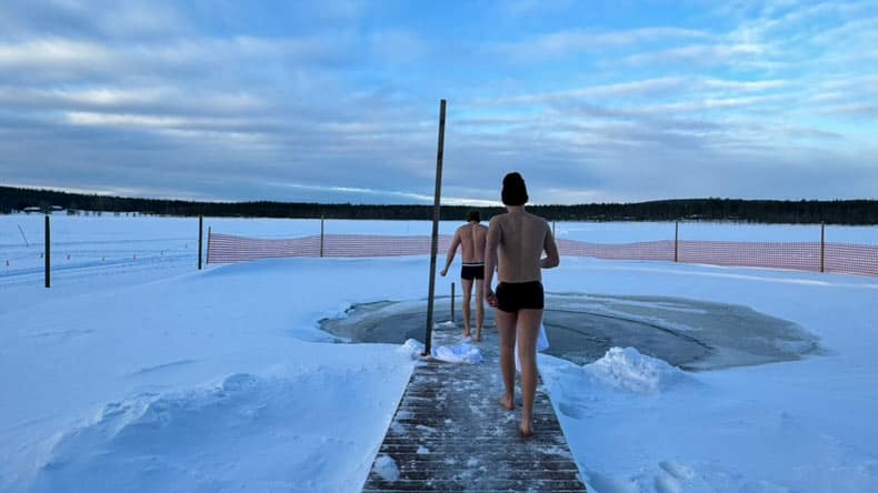 Tipp zum Eisbaden: In Rovaniemi könnt ihr beim Ounasvaaran Latu Ice Hole Swimming in der Straße Jäämerentie 9, immer mittwochs und sonntags zwischen 18:00 Uhr und 19:00 Uhr (Änderungen vorbehalten), direkt im Fluss „Kemijoki“ eintauchen.