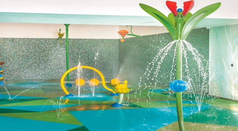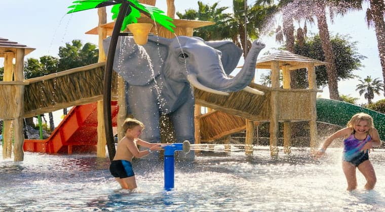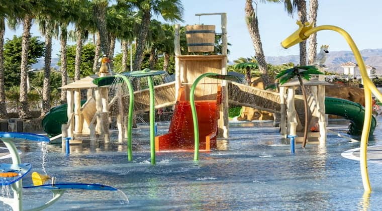 Besonderheit in diesem Hotel mit Aquapark ist der Pool mit strandähnlichem Zugang (Maximale Tiefe 30 cm). Einen separaten Bereich für Babys und Kleinkinder gibt es hier auch – mit einem beschatteten Poolbereich und seit 2019 auch mit einem Indoor Splash Bereich für die Kleinsten. Die vielfältigen Wasserrutschen im Hotel mit Themen-Wasserpark sind die Hauptattraktion.