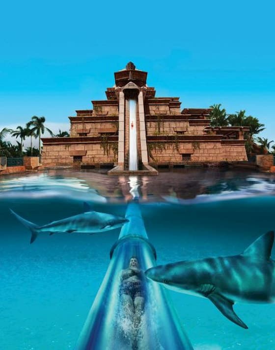 - „Leap of Faith„: senkrecht Rutschen aus einer Höhe von 9 Stockwerken durch eine mit Haien gefüllte Lagune