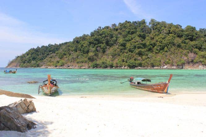Doch trotz Inselhoppings sind wir immer noch nicht satt! Wir wollen gerne noch eine weitere, weniger besuchte Thai-Insel bereisen. Eine Freundin gibt uns den Tipp „Koh Lipe“, welche kurz vor der malaysischen Grenze liegt und so entschließen wir uns für die dreitägige Tour zu diesem Inselparadies. Koh Lipe ist eine der vielen kleineren und größeren Inseln des Tarutao Marine National Parks und die einzige von ihnen, die für den Tourismus im größeren Stil freigegeben ist. „Tourismus im größeren Stil“ heißt aber glücklicherweise nicht, dass hier ein zweiter Ballermann entstanden ist, sondern, zumindest bis dato, nur eine kleinere Backpacker- und Familienurlaubs-Szene auf der kleinen 3 x 1 Kilometer „großen“ Insel existiert. Das Wasser hier ist wirklich türkisblau und es gibt noch viele intakte Korallenriffe zum Schnorcheln und Tauchen. Falls einer aber doch mal die Nase von den anderen Touristen voll hat, kann er sich per Longtailboot auf die einsamen Nachbarinseln Koh Rawi oder Koh Adang begeben.