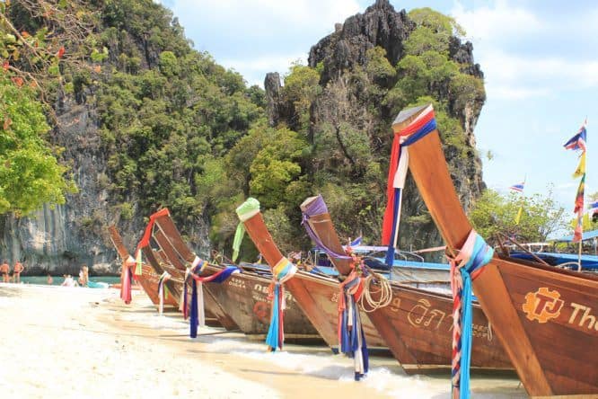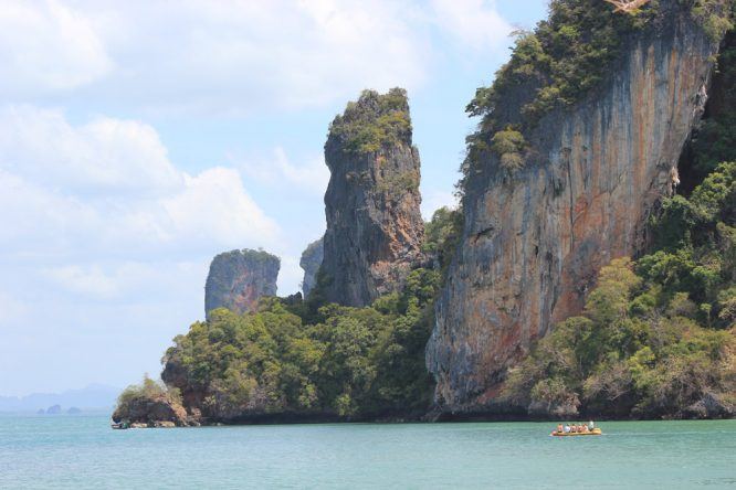 Für die beiden darauf folgenden Tage buchen wir jeweils eine andere Thailand-Inselhopping-Tour, um möglichst viele der magisch wirkenden Felsformationen und versteckten goldenen Buchten sehen zu können. Ein motorisiertes Langboot bringt uns von Strand zu Strand und von Insel zu Insel. Wir freuen uns tierisch, die Motive, die wir sonst nur von Postkarten kennen, live zu erleben. Neben den meist halbstündigen Stopps an den jeweiligen Stränden beinhaltet die ganztägige Tour häufig auch ein Mittagessen, das den Gästen in Form eines Lunch-Pakets oder gar eines eigens angerichteten Buffets an einem der Strände dargeboten wird.