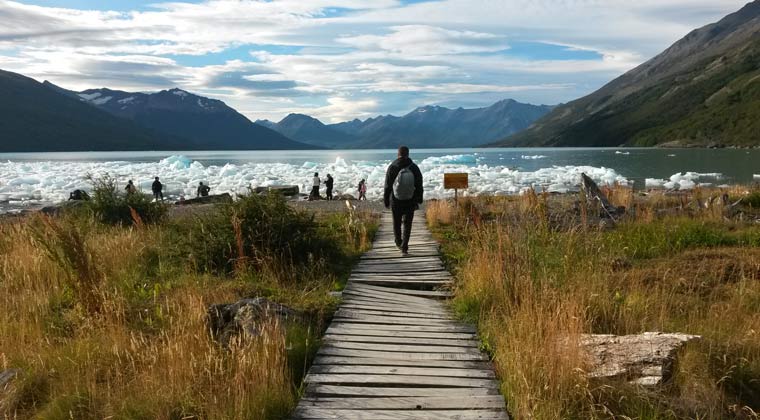 Der See berührt hier den atemberaubenden Gletscher Perito Moreno. Mit seiner Länge von vier Kilometern zieht er sich durch das Bergtal und ragt bis zu 70 Meter in die Höhe. Auf Holzstegen gelange ich immer näher an die Front des Gletschers. Schon aus der Ferne höre ich immer wieder ein lautes Krachen. Und je näher ich dem Gletscher komme, desto besser kann ich beobachten, wie immer wieder große Eisplatten abbrechen und wellenschlagend im Lago Argentino versinken.