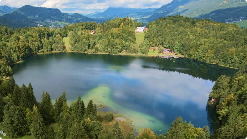 Alpenglühen trifft Wasserfreude – der Freibergsee ist ein echter Bergsee-Traum. Auf 930 Metern Höhe badest du mit Postkartenblick, umgeben von Buchen, Tannen und alpiner Kulisse. Wer einmal hier war, vergisst es nie.