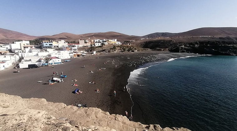 Die Zufahrt auf einer holprigen Schotterpiste von Morro Jable entlang der Bergkette im Naturpark Jandia im Süden dauert rund eine halbe Stunde und fühlt sich an wie das Ende der Welt. Bis auf ein paar verstreute Häuser ist die Gegend menschenleer und unbebaut. Die endlosen Sandflächen und der schwierige Zugang zum Strand sorgen dafür, dass der Strand alles andere als überlaufen ist.