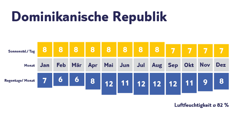 Genau so ist es übrigens mit der Dominikanischen Republik in der Karibik: Von Juni bis November kann schon mal ein Hurrikan um die Ecke wehen und sich die ein oder andere Regenwolke entladen. Im Dezember, Januar und Februar sind hingegen durchschnittlich warme 29 Grad an Land und 27 Grad im Wasser. Also fast wie in der Badewanne!