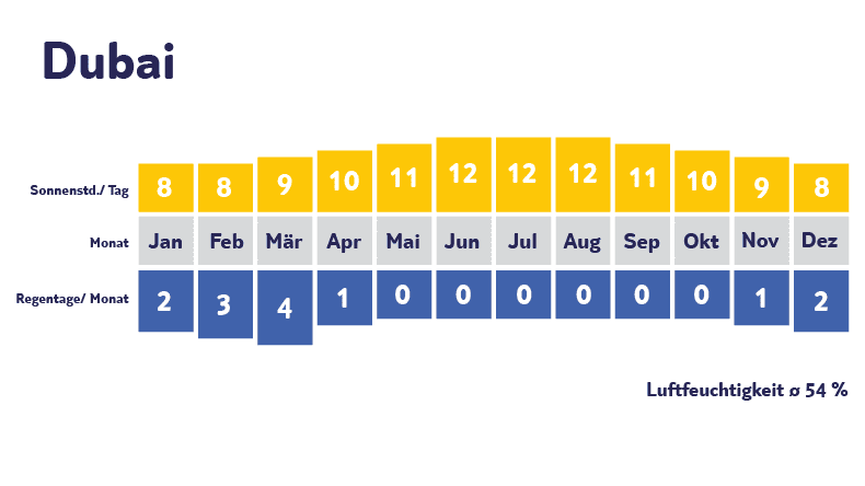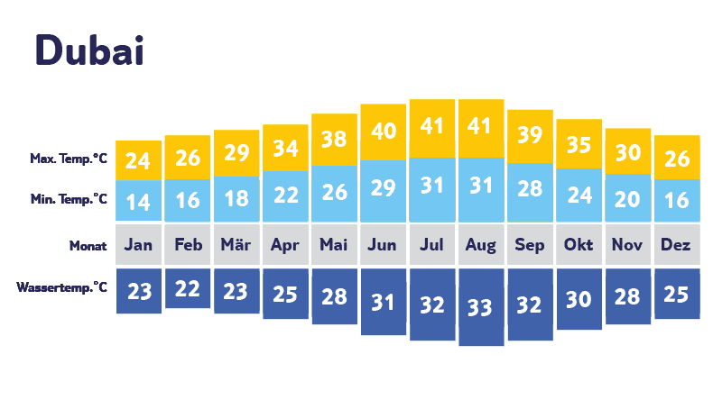 Auch Dubai ist das ideale Winterurlaubsziel für alle, die sich nach viel Sonne sehnen. Durch das subtropische Klima herrschen im Winter in der Stadt am Persischen Golf noch angenehme 24 bis 30 Grad bei bis zu neun Sonnenstunden am Tag. Regen fällt in Dubai selten, in den Wintermonaten nur sehr wenig. Für viele ist das Emirat damit der perfekte Ort für den Winterurlaub, denn in den Sommermonaten kann es hier so heiß und auch feucht werden, dass viele Urlauber lieber in klimatisierten Shopping Malls oder sogar in der Skihalle in Dubai Abkühlung suchen, statt bei über 40 Grad im Schatten am Strand zu liegen.