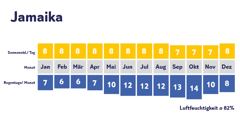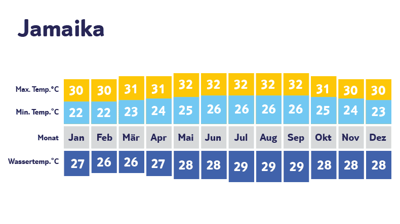 Ähnlich sieht es auf Jamaika aus. Hier herrschen ganzjährig Tagestemperaturen von 22 bis 32 Grad. Außerhalb der Hurrikansaison, die von August bis November dauert, und der niederschlagsreichen Monate Mai, Juni und September bis November, bietet sich daher ein Badeurlaub an. Damit gelten die Wintermonate aber auch als Hochsaison für Touristen.