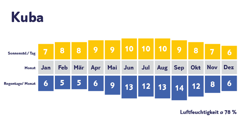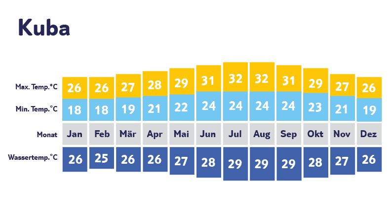 Auch auf Kuba teilt sich das Wetter in Regen- und Trockenzeit. Wer keinen tropischen Wirbelsturm und Regengüsse miterleben mag, sollte von Dezember bis April dem karibischen Inselstaat einen Besuch abstatten, denn dann herrscht hier Trockenzeit. Die Höchsttemperaturen auf Kuba liegen in den Wintermonaten bei 27 Grad, die Wassertemperatur beträgt etwa 26 bis 27 Grad.