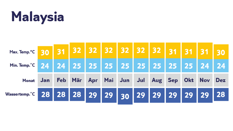 In Malaysia herrschen unterschiedliche klimatische Bedingungen. Von November bis März könnt ihr den Westen des Landes sehr gut bereisen, also u. a. die Hauptstadt Kuala Lumpur und die beliebten Inseln Penang und Langkawi. In den Wintermonaten ist es hier vergleichsweise trocken und warm, wobei es zu erwähnen gilt, dass es aufgrund des Äquatorialklimas im gesamten Land feucht und heiß ist. Mit Regen müsst ihr quasi immer rechnen, im Westen der Insel allerdings zu dieser Zeit weniger.