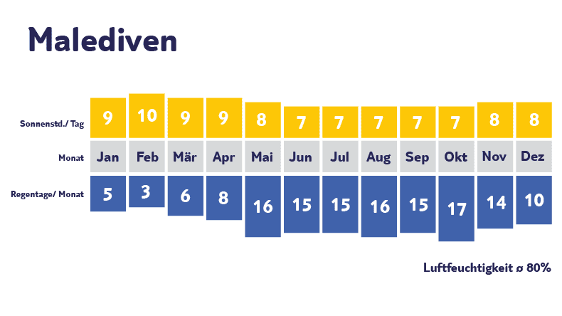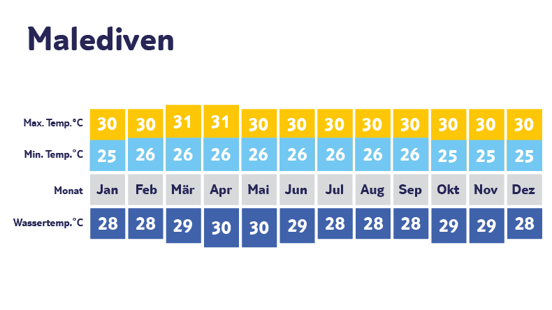 Wo ist es im Winter warm? Na klar, auf den Malediven! Sonne satt, azurblaues Meer und traumhafte Strände erwarten euch auf den Malediven zu jeder Jahreszeit. Besonders schön ist es von Januar bis März, denn dann scheinen täglich neun bis zehn Sonnenstunden und die Wassertemperatur liegt bei etwa 28 Grad. Weihnachten unter Palmen kann also kommen!
