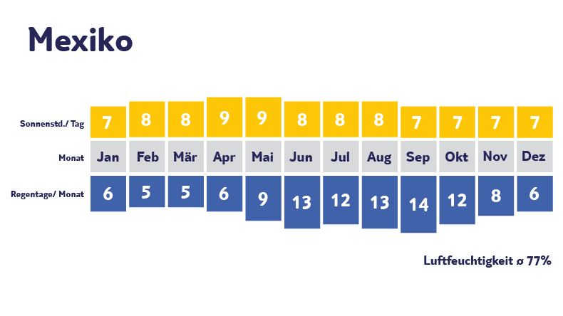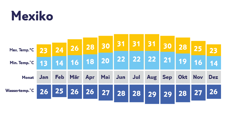 Für Mexiko liegt die ideale Reisezeit in der Trockenzeit zwischen Dezember und April. Dann habt ihr die besten Chancen auf einen tollen und sonnigen Badeurlaub. ► Die schönsten Strände Mexikos. Je nachdem, welche Aktivitäten ihr plant, können auch andere Reisemonate interessant sein. Eine Rundreise zum Beispiel lässt sich gut in die Zwischensaison legen. Die Reisezeit zwischen Januar und März ist einfach ideal um die Welt der Maya und andere kulturelle Schätze Mexikos kennenzulernen. Blogtipp für Kulturinteressierte: ► Die TOP 10 Mexiko Sehenswürdigkeiten