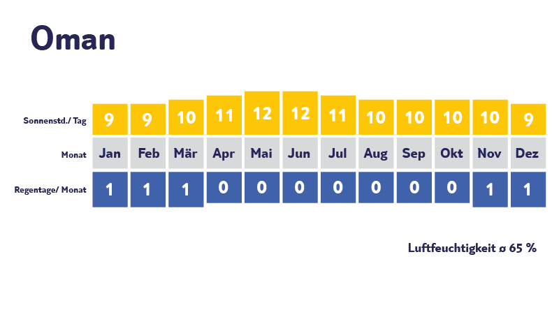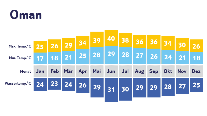 Ihr fragt euch, wo es im Winter warm ist? Im Oman! Die beste Zeit, um den Oman zu bereisen, ist von November bis März. Während es in den Sommermonaten mit an die 40 Grad viel zu heiß für uns Europäer ist, könnt ihr im Winter mit angenehmen 25 bis 30 Grad rechnen. Das Sultanat Oman liegt im Südosten der Arabischen Halbinsel und ist wahnsinnig vielseitig. Von Wüstenlandschaften und traumhaften Sandstränden bis hin zu spektakulären Wadis (Tälern) und der zauberhaften Hauptstadt Muscat – hier ist für jeden was dabei.