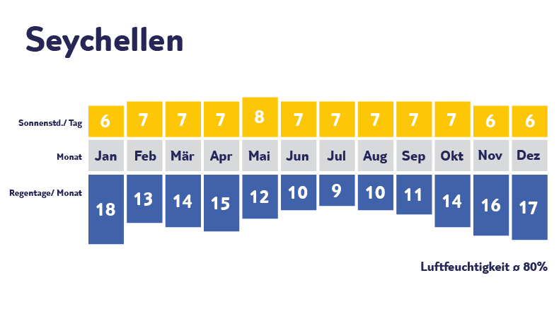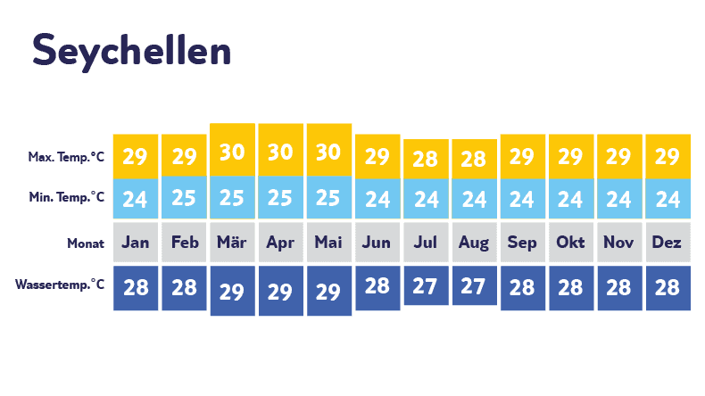 Die Seychellen sind ein wahrgewordenes (Urlaubs-)Paradies! Weiße Sandstrände, üppiges Grün, versteckte Buchten, exotische Tiere – und das alles in nur 10 Flugstunden Entfernung erreichbar. Die beste Reisezeit für die Seychellen ist quasi IMMER. Es gibt zwar eine Regenzeit, die gleichzeitig auch die Sommerzeit ist, und von Dezember bis Februar dauert; allerdings fällt nur ein kurzer tropischer Schauer vom Himmel und oft auch nur in der Nacht. Womit allerdings nicht jeder klarkommt, ist die hohe Luftfeuchtigkeit von etwa 80 Prozent und der Windstille. Zum Tauchen und Schnorcheln sind die Monate November bis März dann allerdings wieder ideal, da das Wasser klar und ruhig ist. Dann könnt ihr vielleicht auch mit Riesenschildkröten schwimmen!