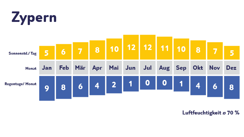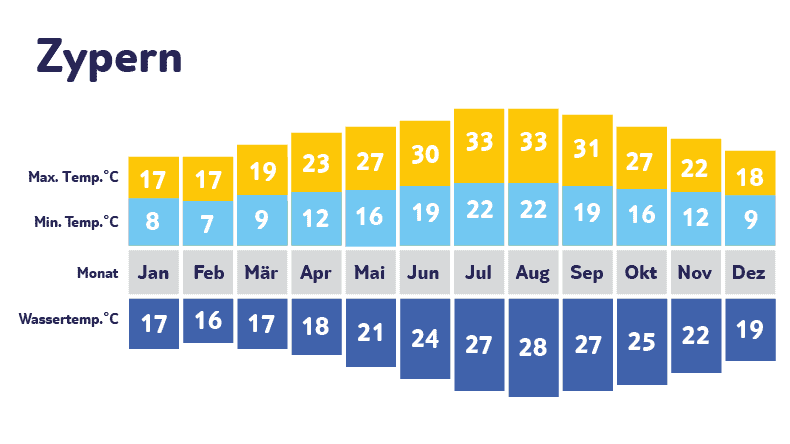 Die Wintermonate fühlen sich in den Tälern Zyperns eher wie Spätsommer und Herbst an. Die Sonne scheint, die Tagestemperaturen liegen bei rund 20 Grad und es regnet ab und an. Im November kann es auf Zypern noch bis zu 22 Grad warm werden und auch Baden ist gut möglich. Ab Februar blühen auf Zypern die Mandelbäume – besonders schön zu sehen in den Ausläufern des Troodos-Gebirge. Hier könnt ihr übrigens mit etwas Glück zwischen Dezember und April auch Ski fahren. Also: Vormittag zum Strand, nachmittags in den Schnee!