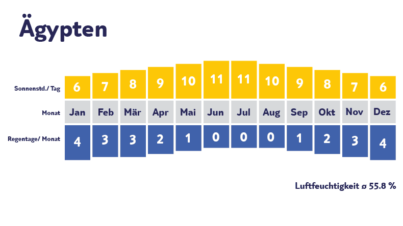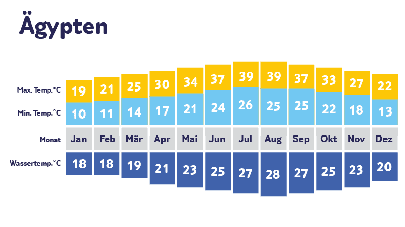 Ägypten ist vom subtropischen Klima geprägt und damit warm und trocken. Während das Thermometer in den Sommermonaten schon mal heiße 35 bis 45 Grad im Landesinneren anzeigen kann, herrschen von Dezember bis Februar immer noch angenehme Temperaturen von etwa 22 Grad. Nur nachts kühlt es sich stark ab. Für alle, die in ihrem Badeurlaub auch ein bisschen Kultur erleben wollen, ist Ägypten damit das perfekte Reiseziel im Winter. Denn wer möchte schon bei stickigen 45 Grad mit dem Quad durch die Wüste fahren oder die Pyramiden und die Große Sphinx von Gizeh besuchen? Und über Regen braucht man sich ja in Hurghada & Co. sowieso keine Gedanken machen – auch in den Wintermonaten nicht.
