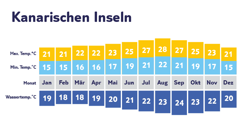 Hauptreisezeit für die Kanaren ist natürlich der Sommer, aber auch im Winter lässt es sich hier bei milden Temperaturen zwischen 21 und 23 Grad wunderbar genießen. Zahlreiche Deutsche flüchten jährlich vor dem kalten Winter auf die Inseln des ewigen Frühlings im Atlantik. Jahreszeiten im klassischen Sinne existieren auf Teneriffa, Fuerteventura, Gran Canaria, Lanzarote, La Palma und Co. nicht. Das Klima ist ganzjährig mild und beschert der spanischen Inselgruppe durchschnittlich 300 Sonnentage im Jahr.