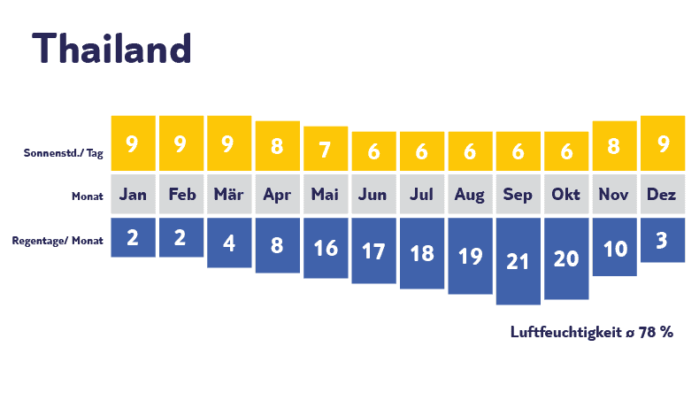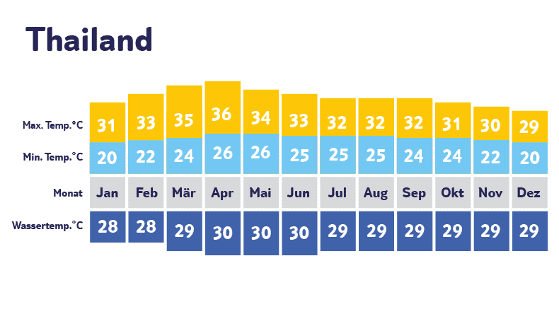 In Südthailand (u.a. Krabi, Phuket, Koh Samui, Koh Lipe, Khao Lak, Koh Phi Phi) geht die Trockenzeit von Dezember bis April. Besonders heiß wird es im März und April. Zwischen Mai und November müsst ihr mit monsunartigen Regenfällen rechnen. Baden gehen könntet ihr dann zwar trotzdem, doch die extrem hohe Luftfeuchtigkeit in der Regenzeit empfinden nicht alle als angenehm. Unser Blogtipp: ► 8 Gründe, warum ihr in Thailand Urlaub machen solltet