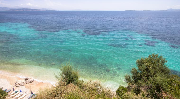 Beginnen möchte ich mit einem der schönsten Korfu Strände: der Sandstrand Paleokastritsa. Du hast einen fantastischen Blick auf drei Buchten und kleinen Stränden, die du mit einem Boot anfahren kannst. Beim Hauptstrand hast du die Sicht auf das Kloster Jungfrau Maria, welches ein kleines Museum beinhaltet. Das glasklare Wasser bietet dir eine herrliche Abkühlung bei warmen Sommertagen. Wenn du gerne schnorchelst, hast du hier auch sehr gute Möglichkeiten.
