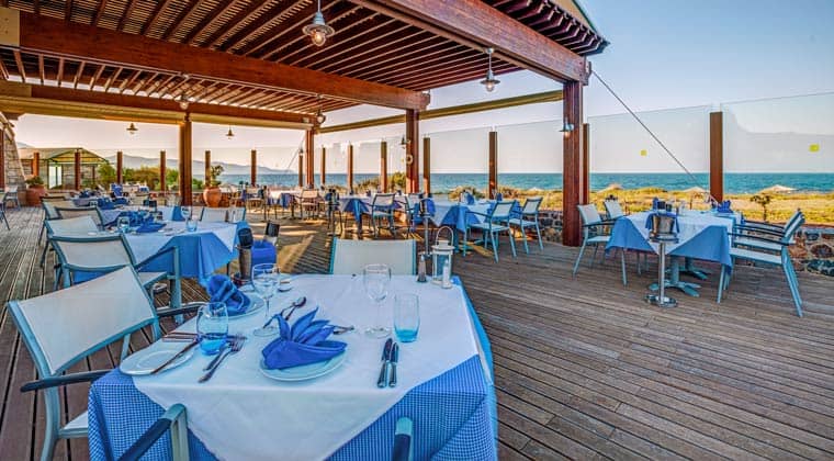 - Typisch griechische Atmosphäre: Ihr könnt in der Taverne mit direktem Blick aufs Meer speisen.