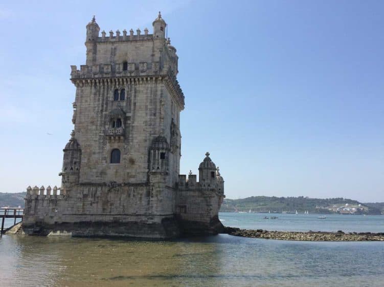Gleich in der Nähe befindet sich ein weiteres bekanntes Wahrzeichen, das mich umhaut. Der 35 Meter hohe Torre de Belém wurde 1521 im manuelinischen Stil erbaut und liegt direkt an der Tejomündung. Halb an Land, halb im Wasser, fotografiere ich das ehemals fungierende Gefängnis.
