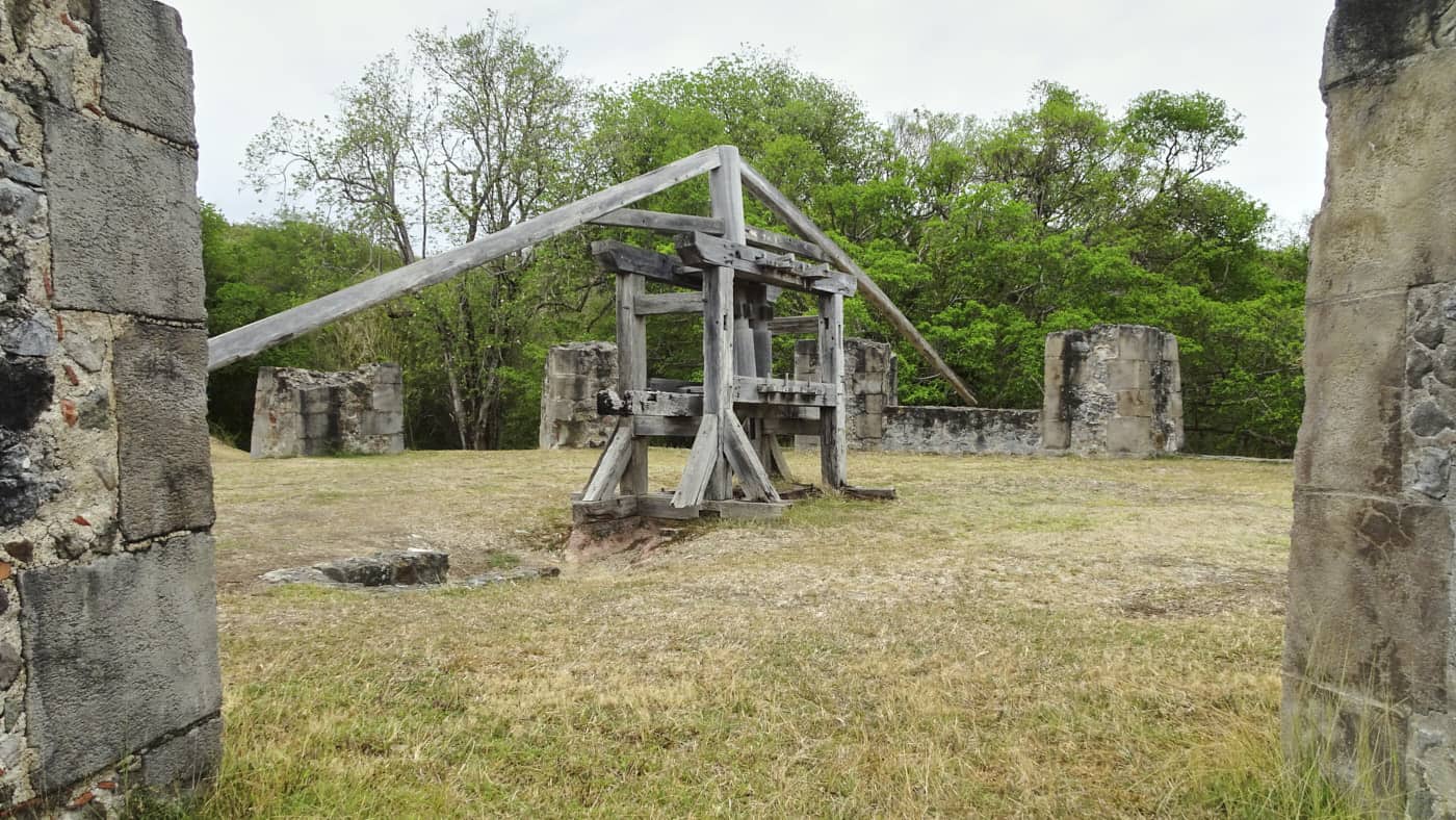 Die Ruinen eines Herrschaftshauses und der dazugehörigen Rumdestillerie liegen still auf einem Hügel. Mit einem englisch/französischen Audioguide wird die Geschichte des Hauses erklärt. Viel hören wir dazu über die Sklaverei. Ohne die unzähligen Sklaven aus Afrika, wäre die Rumproduktion in der Karibik in diesem Umfang gar nicht möglich gewesen. Unten, jenseits der Mangroven wurden die Fässer dann gleich verschifft. Von hier starten auch mehrere Wanderwege.
