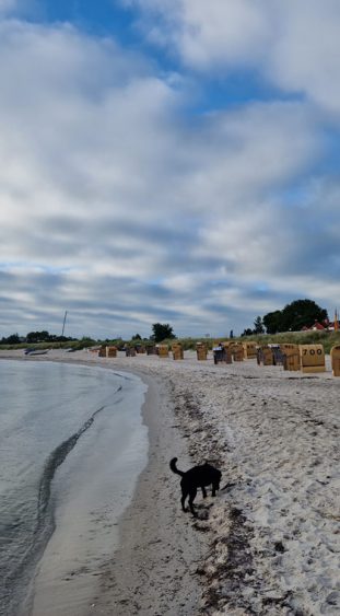 Unser erster Weg führt direkt ins Wasser. Der Einstieg ist lang und flachabfallend. Paul kann es kaum erwarten, dass ich seinen Ball in die See werfe und springt an mir hoch. Das Wasser spritzt und innerhalb von wenigen Sekunden bin ich von zwei weiteren Hunden umringt. Der Ball fliegt und die wilde Meute stürzt sich fröhlich in die Ostsee. Wieder und wieder werfe ich den Ball. Ich bin nass und voller Sandspritzer.