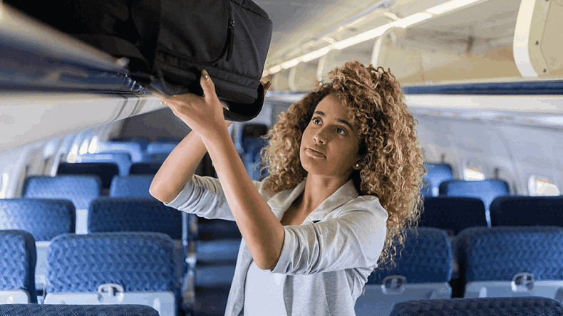 Handgepäck wird in der Kabine unter dem Sitz oder in den Fächern über den Sitzen verstaut.