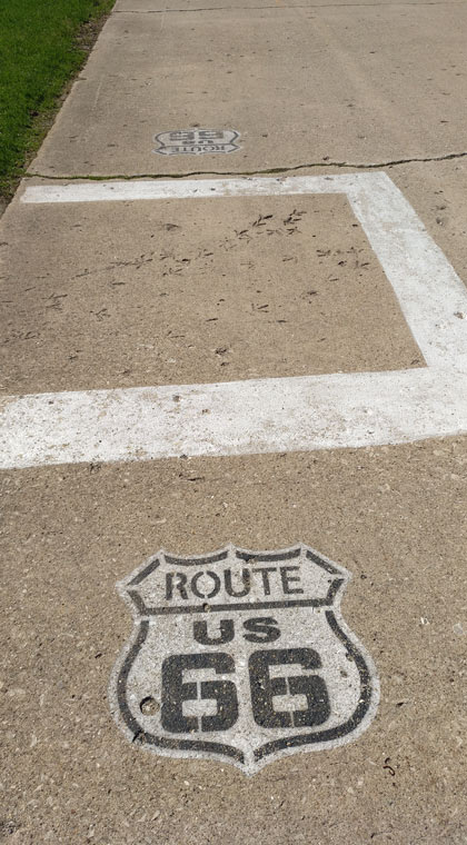 Die Route 66 südlich von Springfield hat einen kurvenreichen Zickzack-Verlauf. Kurz hinter Nilwood, etwas schwierig zu finden, gibt es eine Besonderheit zu bestaunen – über 100 Jahre alte Fußabdrücke von Truthähnen, die in den damals noch nassen Beton der Straße liefen – ein lustiger Fotospot, der sich lohnt.
