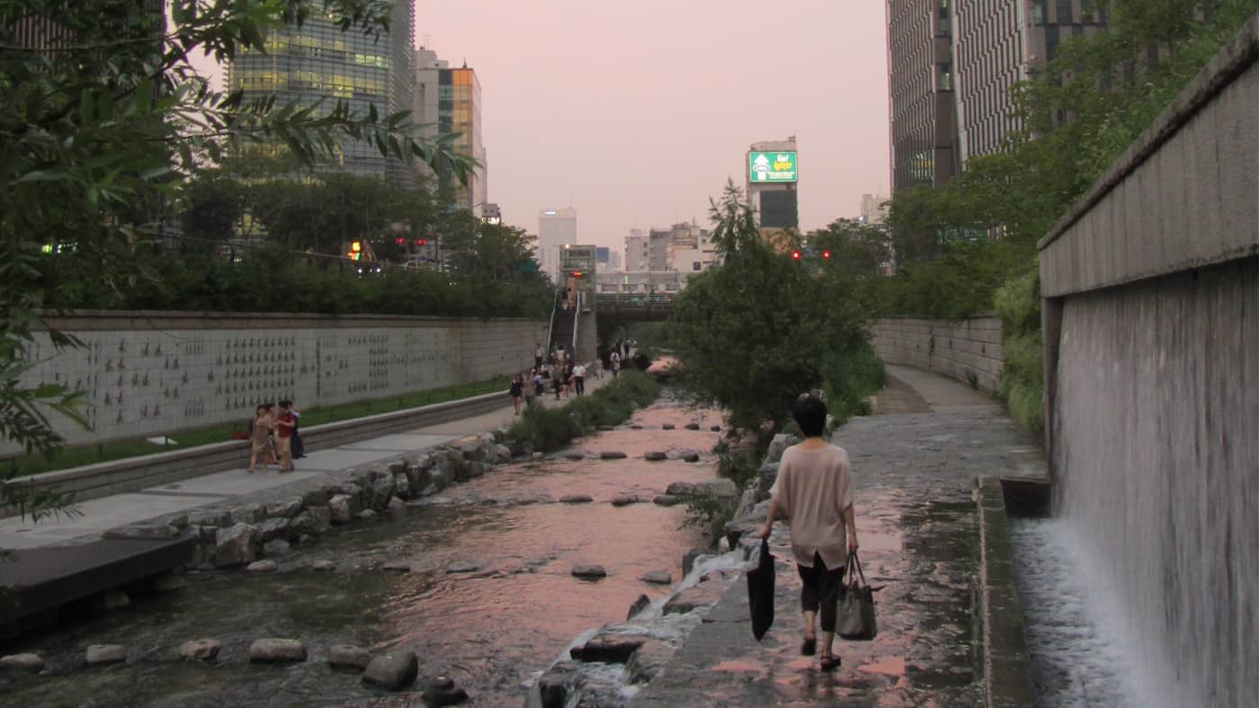 Dazu spaziert ihr durch ein verwinkeltes Gelände mit Torbögen, Wasserläufen, Teichen und Gärten. Wem danach noch nicht die Füße weh tun, sollte unbedingt direkt zum Cheonggyecheon-Fluss weiterlaufen. Der aufwendig renaturierte und 2005 wiedereröffnete Flusslauf zieht sich über mehrere Kilometer durch das Stadtzentrum, bevor er in den großen Hangang müdet. In der Vergangenheit wurde der Cheonggyecheon komplett überbaut und verlief über Jahre unterirdisch. Heute säumt wieder üppiges Grün die Ufer.