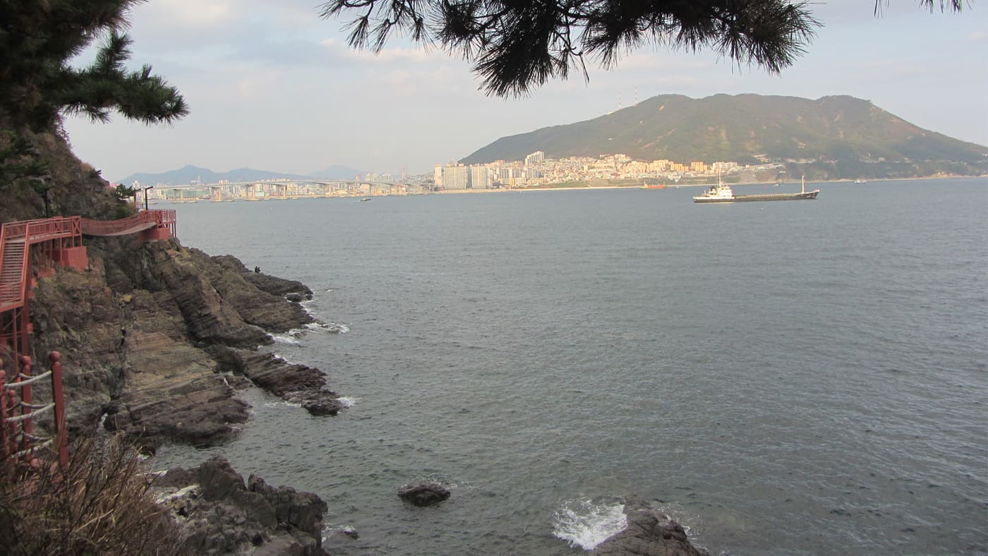 Uns ist stattdessen nach ein wenig Bewegung und so begeben wir uns auf den ca. 3,5 Kilometer langen Amnam Coastal Walk. Auf roten Metallplanken und -stufen marschieren wir an der felsigen Küste entlang und genießen die tolle Aussicht auf die Stadt, die bewaldete Steilküste & das Meer. Obwohl Busan die zweitgrößte Stadt des Landes ist, finden sich auch hier immer wieder grüne Naherholungsgebiete, um sich vom Großstadtlärm zu erholen.