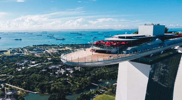 Gleich nebenan wartet das nächste Highlight auf dich: das Marina Bay Sands Hotel mit einer riesigen Aussichtsplattform, von wo aus du einen 360° Panoramablick über die ganze Stadt hast. Das Gebäude sieht ein bisschen aus wie ein Baguette auf drei Stelzen und verfügt über eine Mall mit allerlei Shoppingmöglichkeiten, Restaurants, Bars, Ausstellungen und vieles mehr.