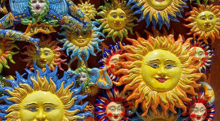 Die Sonne scheint fast immer auf Sizilien. Die Sonne und das Wappen Siziliens könnt ihr in Keramikform beinahe überall kaufen.