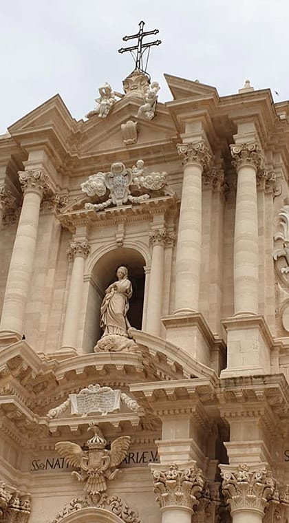 In der Altstadt auf der Halbinsel Ortigia steht der Dom mit seiner prachtvollen Barockfassade. Im Inneren ist deutlich zu erkennen, dass er praktisch um den antiken Tempel der Athene herumgebaut wurde, wobei die Säulen wunderbar integriert wurden. Der Dom ist eine der ältesten christlichen Kirchen im westlichen Mittelmeerraum. Mitten in der Stadt sind die Überreste des Apollontempels zu sehen, an dem der moderne Straßenverkehr vorbeirauscht.