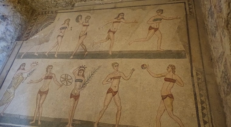 Und die Erfindung des Bikinis scheint doch deutlich vor dem 19. Jahrhundert zu liegen, wie auf dem berühmten Mosaik der Bikinimädchen zu sehen ist. Es handelt sich in diesem Fall allerdings um antike Sportbekleidung und nicht um Bademode. Die Abbildungen (nicht nur die von exotischen Tieren) sind beeindruckend und wirken noch immer sehr lebendig.
