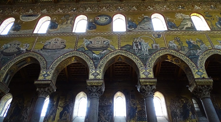 Sehenswert ist auch die normannische Kathedrale in Montreale, ganz in der Nähe von Palermo. Auf über 6000 qm findet ihr Mosaiken auf Goldgrund, die euch den Atem stocken lassen. Wie eine Art antiker Comic ist das alte und neue Testament an den Wänden verewigt und veranschaulichte für die Menschen, die meist nicht lesen konnten, die biblische Geschichte.